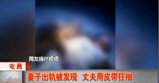 画面中我们可以看到,一名女子平躺在地上,只穿了内衣内裤,用双手捂着脸。在她旁边,一名只穿内裤的中年男子趴在地上。而旁边的另外一名男子则拿着一条皮带,不断地对地上这对男女进行抽打。