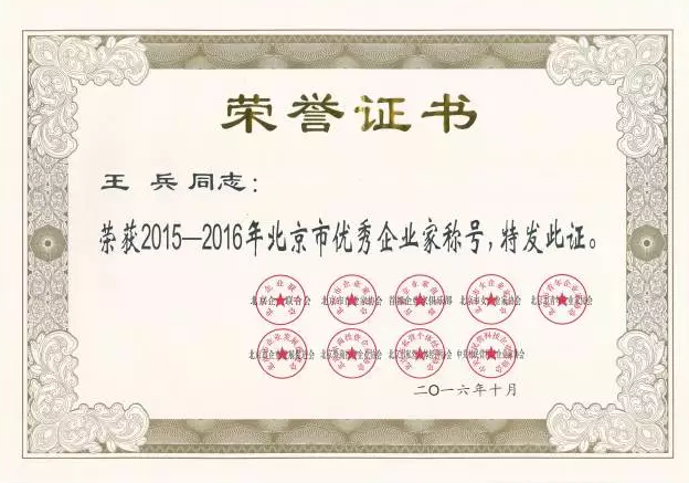 2015-2016年度“北京优秀企业家”表彰大会在北京召开。北京市经济和信息化委员会主任张伯旭等领导和专家出席活动。北新建材董事长王兵、北京银行行长张东宁、北京新能源汽车股份有限公司总经理郑刚等被授予 “2016北京优秀企业家”荣誉称号。