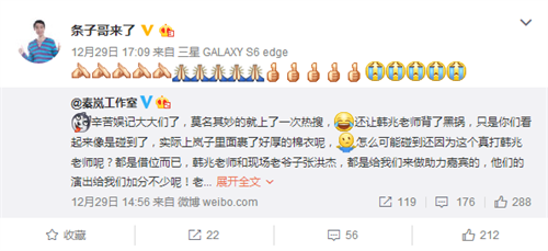 关于秦岚被袭胸的消息传出之后,男演员韩兆也受到众多网友的指责和吐槽,而秦岚工作室也就此事发声明澄清并未被袭胸,“还让韩兆老师背了黑锅,只是你们看起来像是碰到了,实际上岚子里面裹了好厚的棉衣呢,怎么可能碰到还因为这个真打韩兆老师呢?”还透露之前演出合作很愉快。